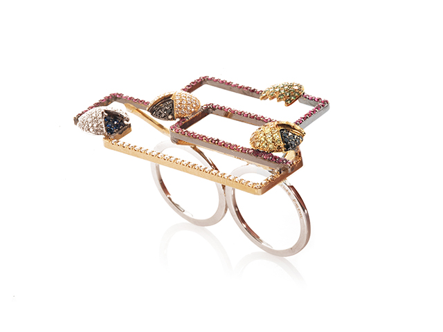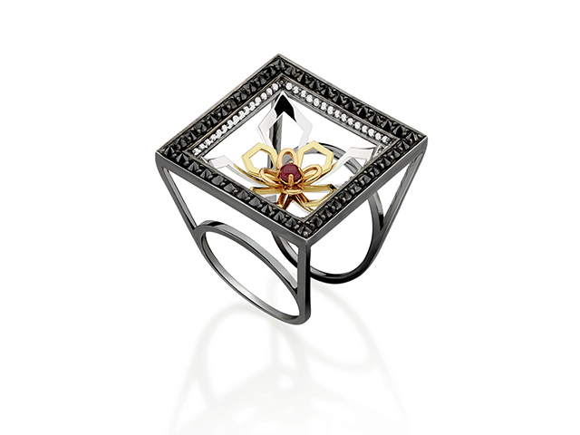 The Portal Collection is a symbol of deep inner knowledge and especially the Lotus ring, thanks to the stones, their geometric lines and the colour palette tells a story of personal introspection. The concept of spiritual growth is then perfectly embodied by the Lotus flower, the symbol of the apex of the spiritual connection.