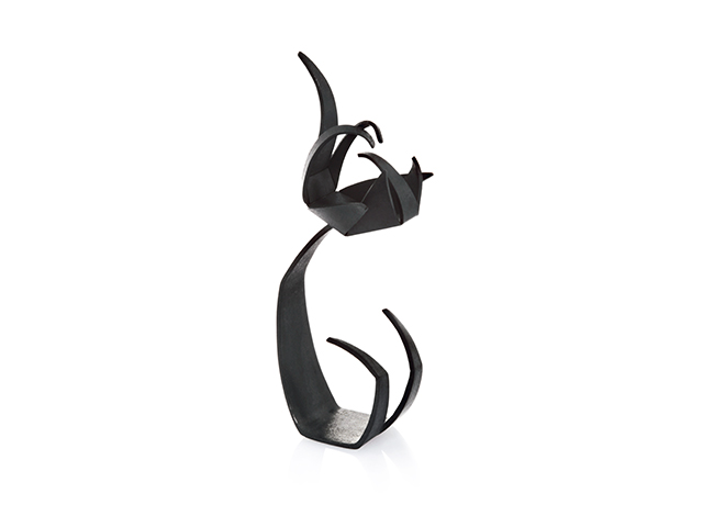 Made in lost wax and direct technique modeling, it pursues the charm of a precarious equilibrium, of the extension, and of the dynamic stress of surfaces and volumes, looking for a sort of perceptive alteration in contrast with the rigidity of the metal for a plastic fluidity of the composition.